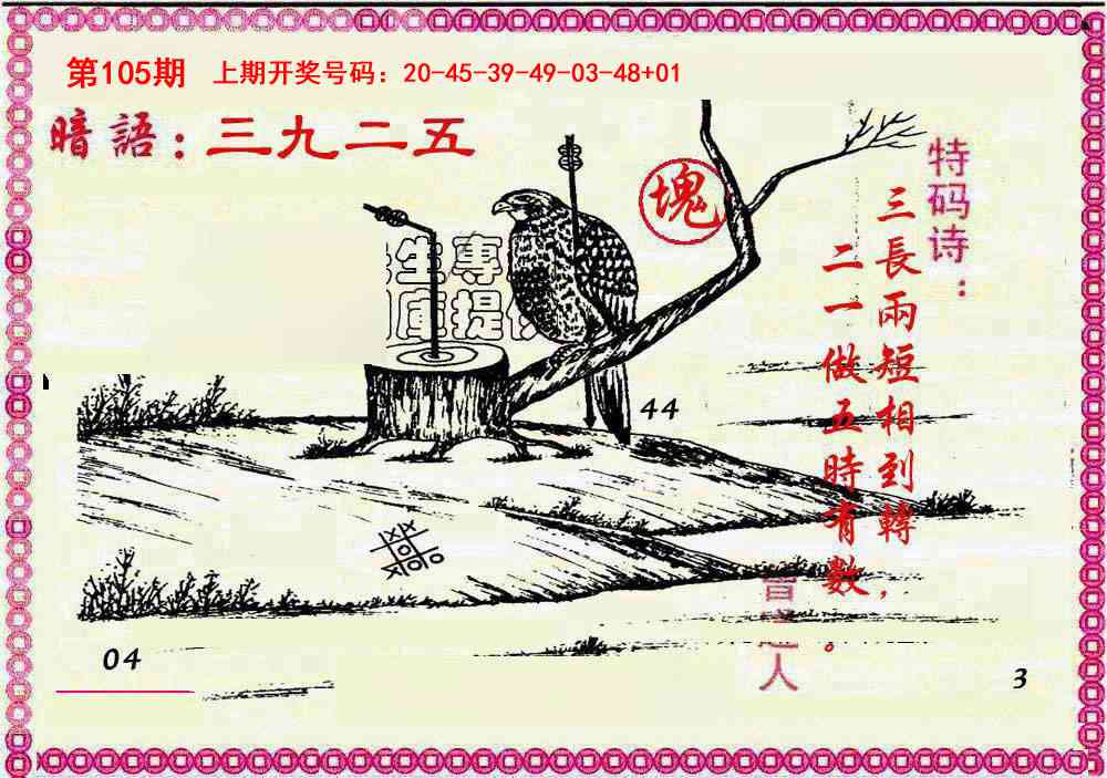 | 035期 | 兔鸡猪蛇猴 | 開:猪44准 |